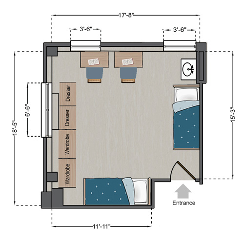 Amenities: Central air conditioning, Wi-Fi, cable, on-site laundry, 24-hour security desk, fraternity and sorority chapter rooms, community lounges on each floor, technology-capable multipurpose room, bike storage outside of building.