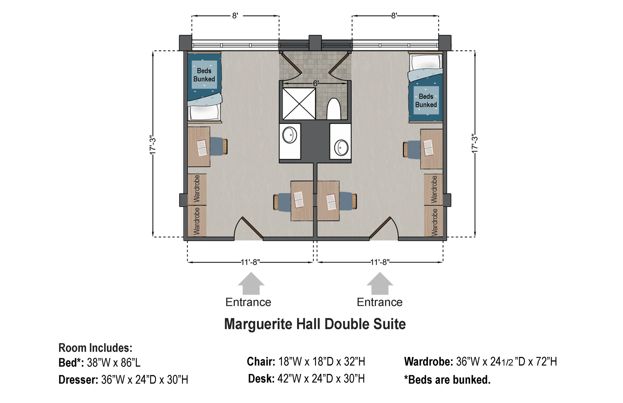 | Bathrooms: | Semi-private. Two rooms share one bathroom. |