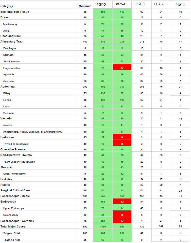 Residents routinely graduate with more than 1,000 cases. This number includes major cases, minor cases, endoscopy, and all logged procedures: